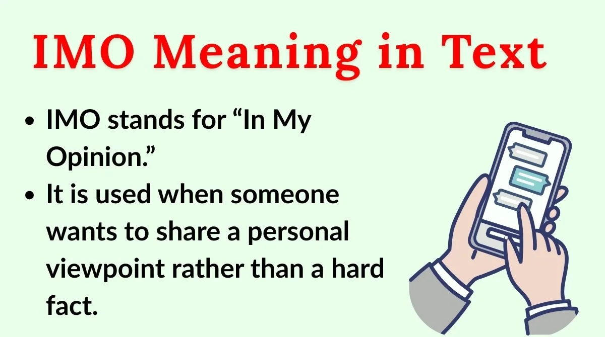 IMO is a simple, friendly way to share your thoughts without sounding too forceful. It softens opinions, keeps conversations polite, and helps people express themselves quickly in digital spaces where short forms rule.