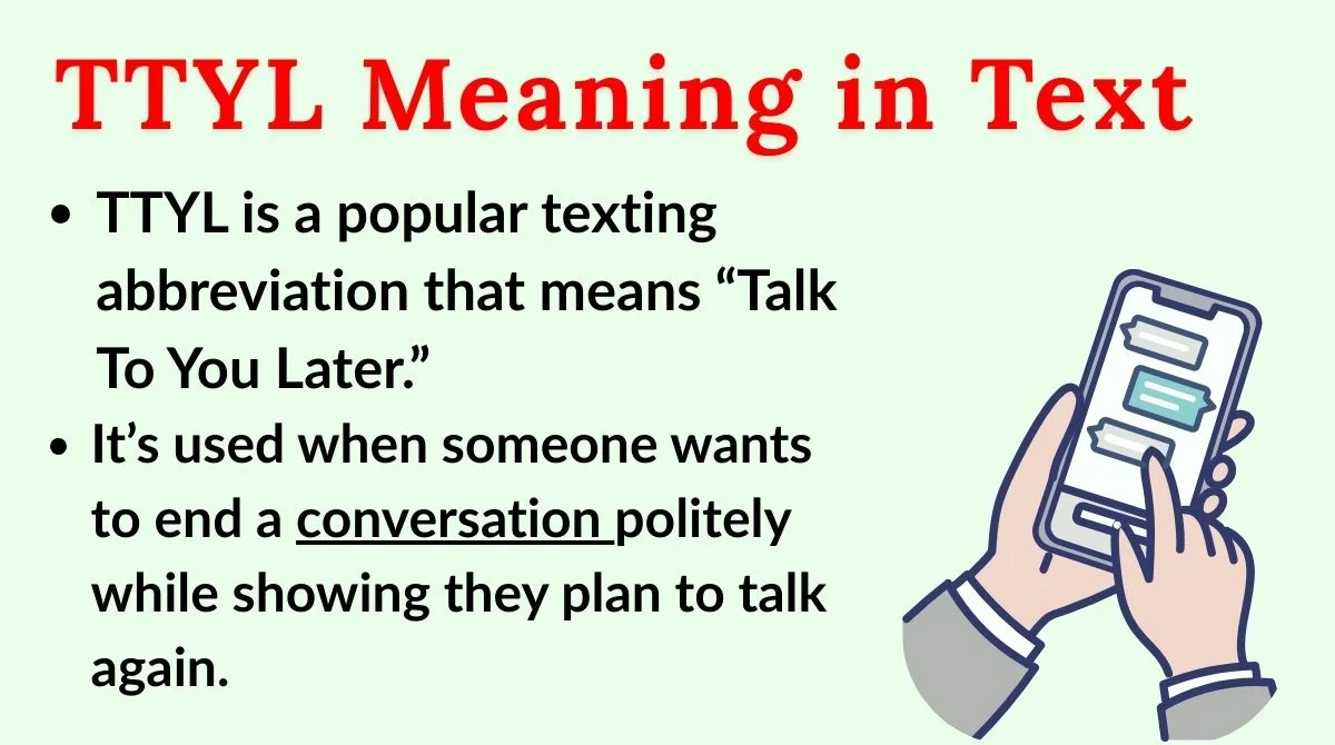 TTYL also helps avoid awkward endings. Instead of stopping a chat suddenly, you can use TTYL to close things smoothly.